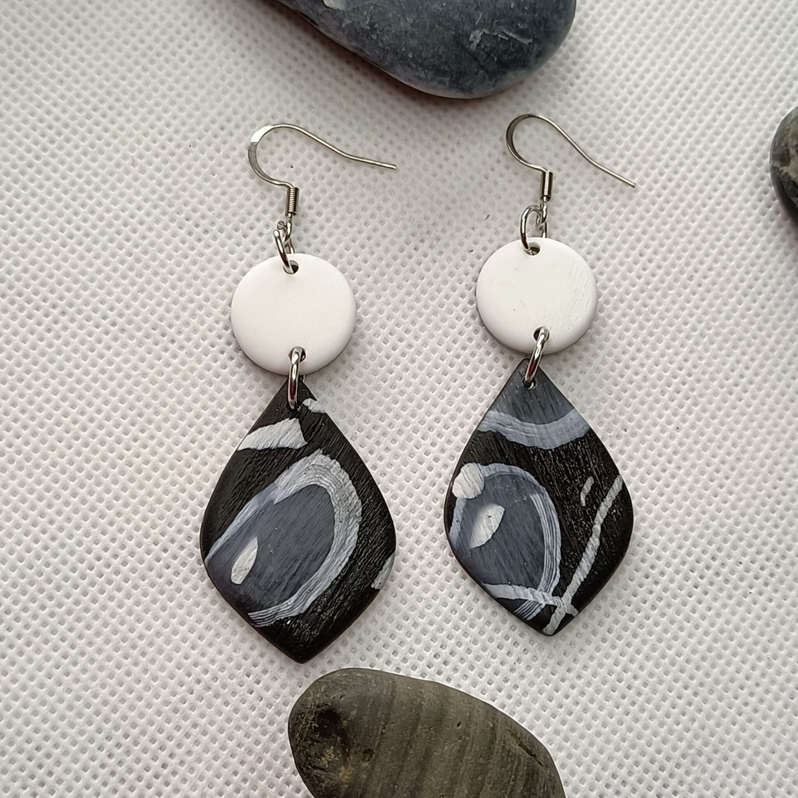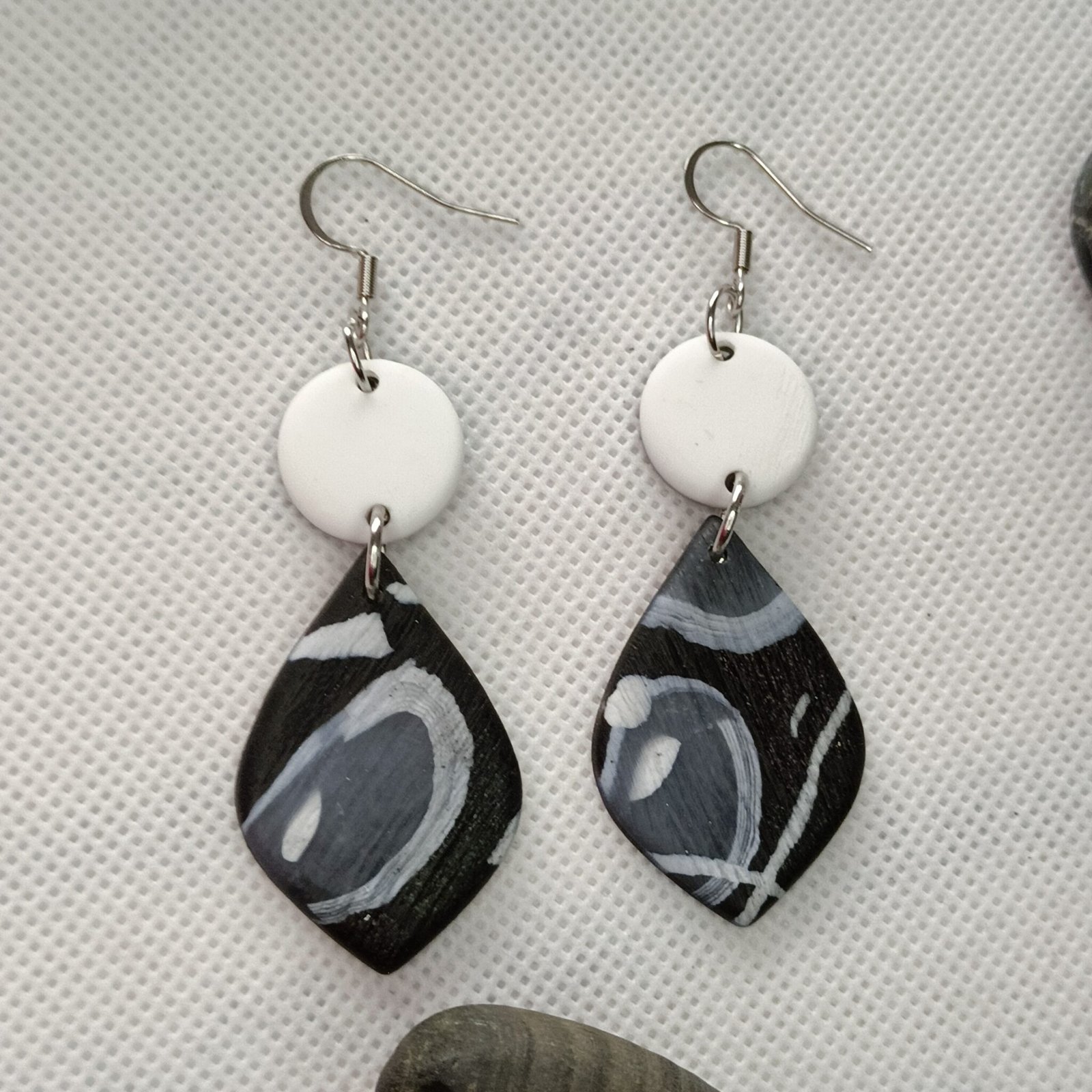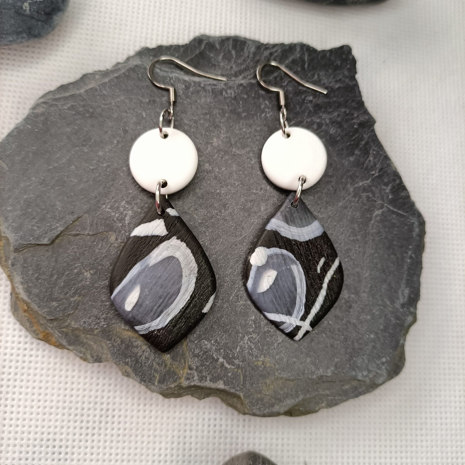 Boucles d’oreilles forme originale blanche et noire en pâte polymère – Création unique et artisanale